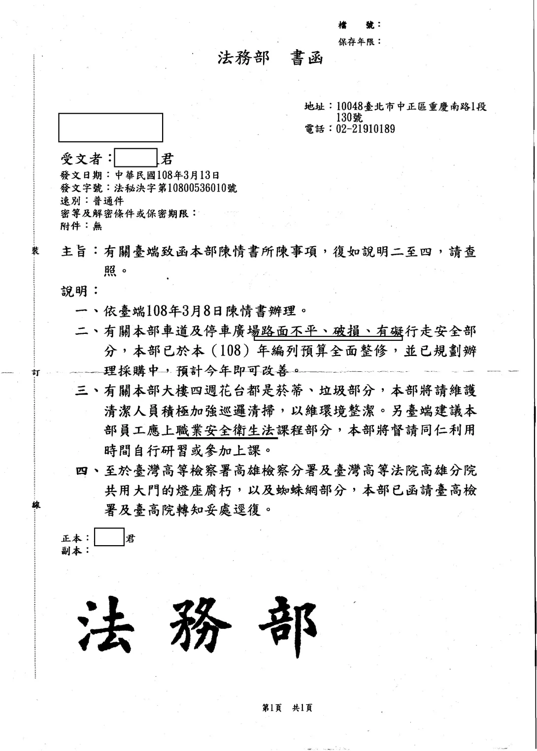 2019年3月13曰法秘決字第10800536010號法務部書函