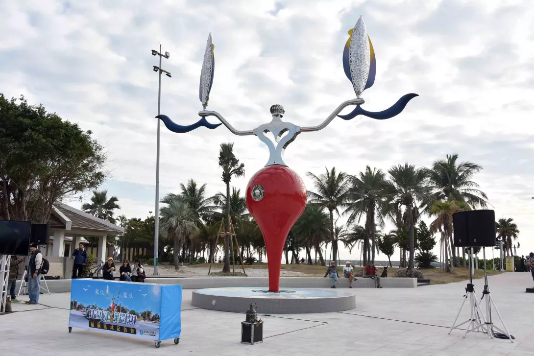 為打造旗津成為藝術之島,高雄市政府於旗津設置裝置地景藝術「風收.豐收」,邀請擅長大型動態藝術創作的造型藝術家梁任宏創作,以如同大海之母揮舞著雙臂的作品意象,訴說旗津發展起源的故事,副市長葉匡時今(20)日主持新地標「插旗」啟用儀式,期能依循國外漁村轉型的成功經驗,將旗津打造成台版的瀨戶內海藝術島。
