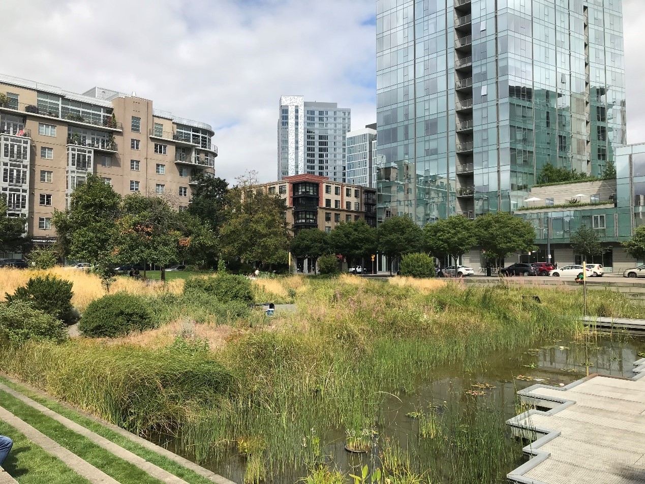 其實,這區域本來是個濕地湖泊,後來因為經濟發展被大規模填平,開發成商業區。不過到了20世紀尾時,政府決定要大改造一番,把近0.9英畝的地還給大自然,與周圍住宅區共存。