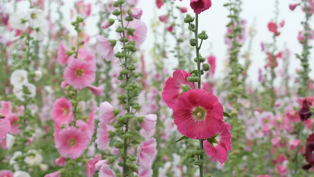 員林蜀葵花田的巧園綠化工作團隊在員林市公所指導下,從蜀葵花播種、育苗、生長到開花,每項環節都是用心呵護,終於順利在今年三月春分節氣盛放,蜀葵花花色繽紛豐富,有大紅、粉紅、紫紅、深紅及白色等,高度可達一至兩公尺以上,因此俗稱一丈紅。