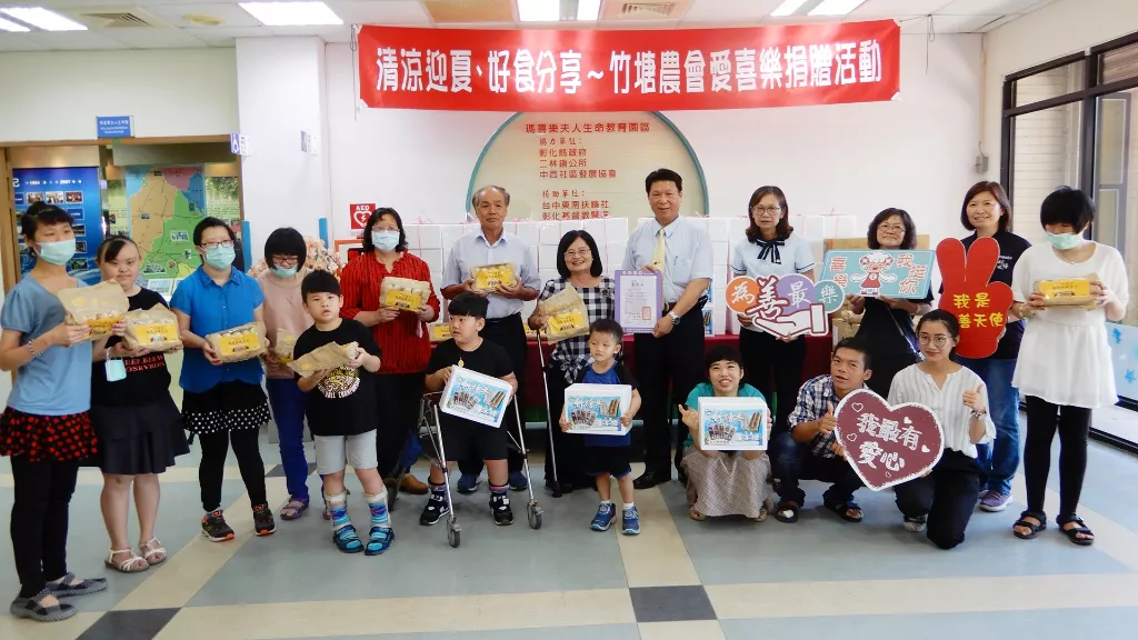 竹塘鄉農會常務監事陳森麟表示,農會員工自發性購買自家產品送給喜樂憨兒享用,也呼籲各界一起響應作公益。因為喜樂每月照顧300多位的服務對象,每天就養、就學、就業、就醫24小時的住宿服務,教養經費龐大,邀請鄉親、社團、企業共同響應,用實際行動幫助喜樂,填補教養經費缺口,讓喜樂憨兒可安心接受教養。