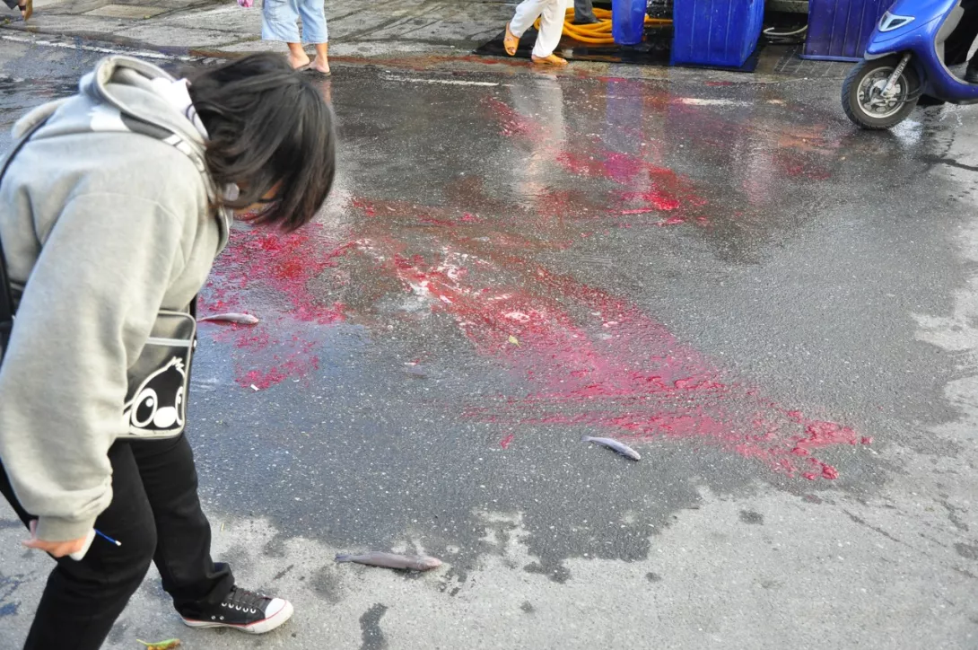 [散會啦!各位!漁民開始清洗地上的血跡]