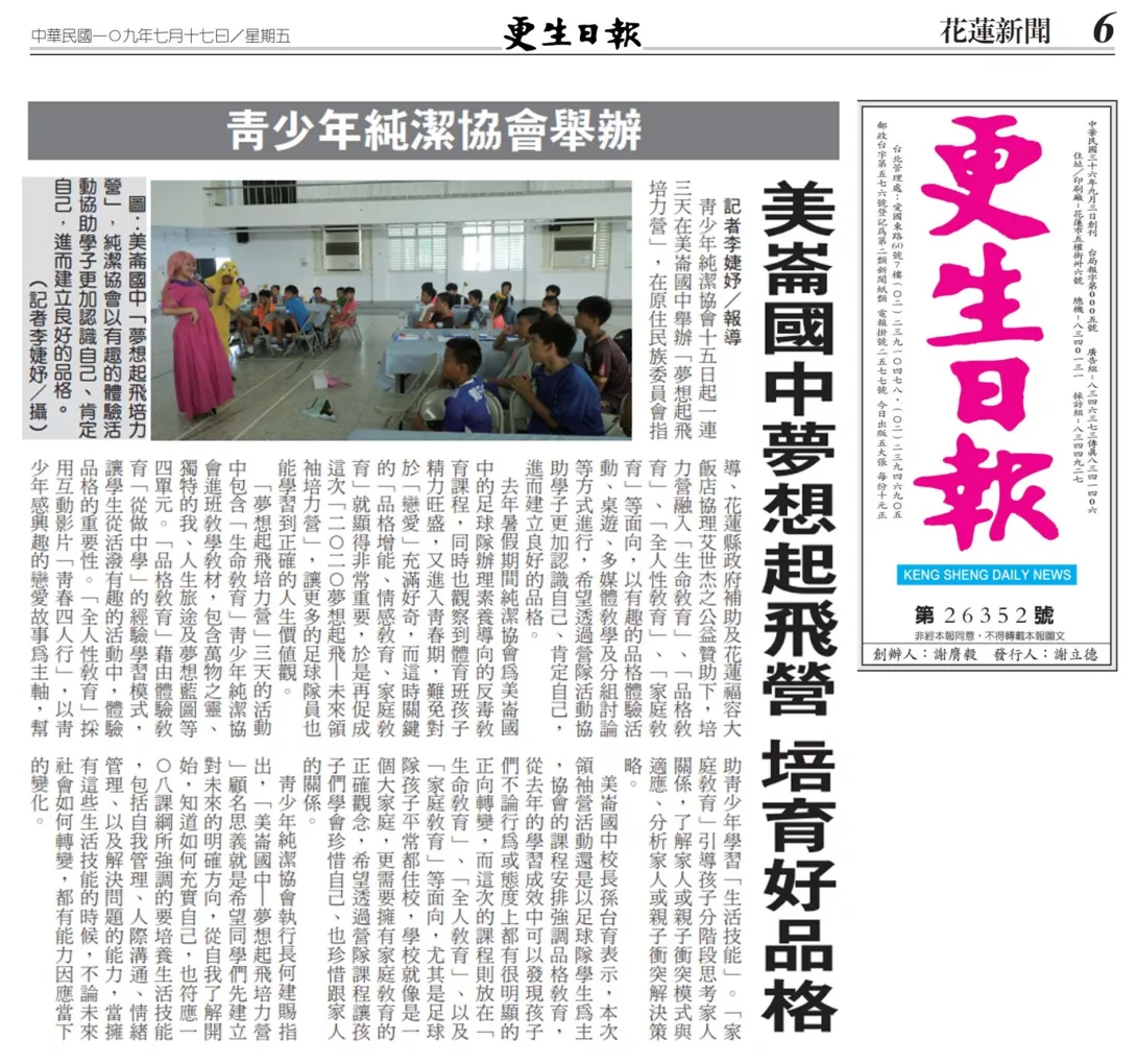 為學生建立良好品格,花蓮市美崙國中與青少年純潔協會二度合作,舉辦為期三天的「夢想起飛培力營」,以桌遊、分組討論及各種體驗活動,引導學生瞭解自己、設立目標,進而為目標而努力。