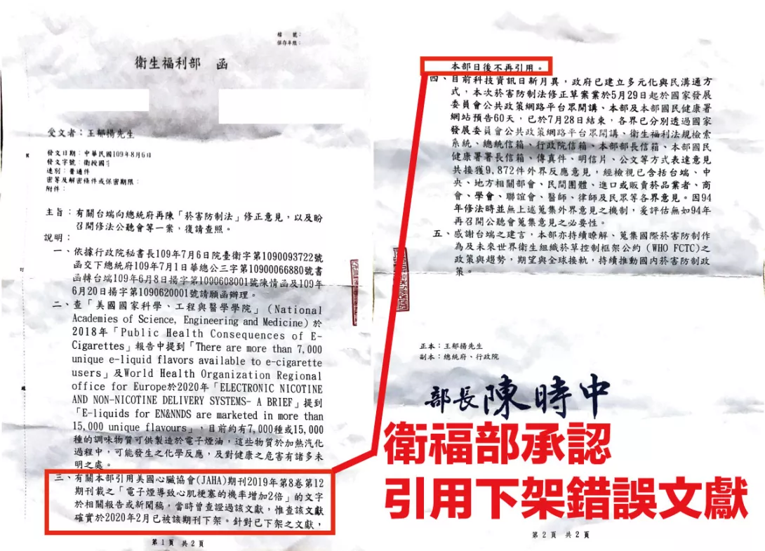 對此衛福部僅回應:「本部菸害防制法修法程序,係透過持續蒐集研析世界衛生組織FCTC締約方會議與國際資料,並綜合國內醫學、公共衛生專家意見,作為菸害防制法修法在電子煙管理之政策方向參考。