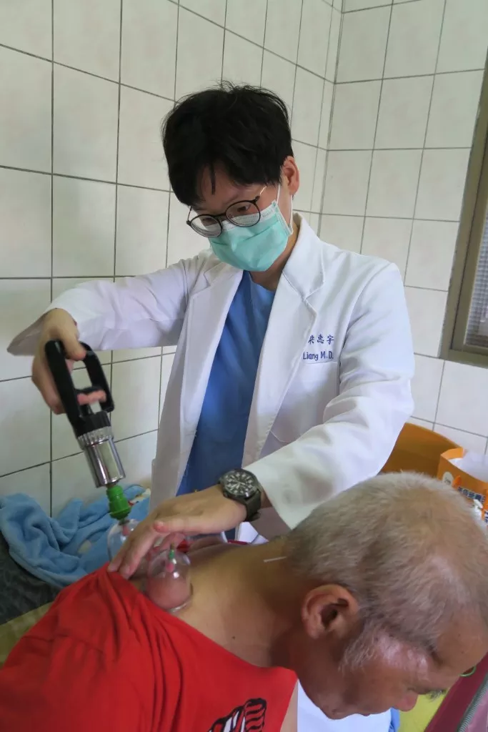 梁惠宇替坐在床上的施伯伯針灸了20多針並電針,同時在後頸及後背拔罐,同樣的動作在2個多月前可是在床上進行。梁惠宇表示,施伯伯左側肌肉萎縮無力,筋比較緊,透過針灸增強其腹肌、背肌及癱瘓側邊的力量,刺激神經傳導,提升整體的體力;拔罐則是活絡氣血,改善循環,再配合中藥調理後,施先生從癱軟臥床,進步到能穩定坐著,再進步到能慢步行走,只花了2個月。