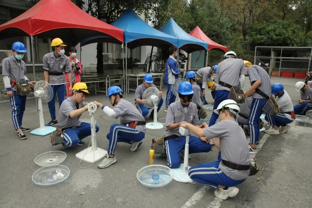 達德商工電機科家電服務隊首次來到中區老人之家服務,進行怡養大樓132位長輩所使用電風扇清潔保養,當天從上午9時起即開始維護整理長者的電風扇,進行清潔立扇、桌扇、等馬達綿絮灰塵與軸心卡毛髮清潔及上油保養,避免電風扇運轉過熱燃燒,總計保養122支電風扇,直至中午12時才整理完畢,剩餘電扇將於下個月再進行保養。