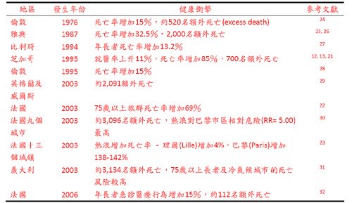 美國的CDC評估每年有240名個案死於熱相關因子,其中,在著名的1995年芝加哥熱浪中,相關死亡人數較他年同期增加了85%,就醫率增加了11%,該時期因熱導致的死亡個案至少有700名左右(*12,13,21)。同樣的,估計法國2003年發生的熱浪事件相關死亡人數(*22),約有11,435人由於連續十五日的高溫而死亡,對75歲以上年齡層更造成69%以上的額外死亡率。進一步分區調查(*23),發現巴黎地區的額外死亡率更高出138-142%,兩份報告均顯示短時間極端氣候對人體健康衝擊極大。在西班牙也有同樣的發現(*2),研究人員發現當溫度超過41℃時,75歲以上族群死亡率會增加51%,心血管疾病風險大於呼吸道疾病,女性風險高於男性。荷蘭研究 (*18)則發現熱浪對所有死亡率均有影響,每天約額外增加12.1 %死亡率。