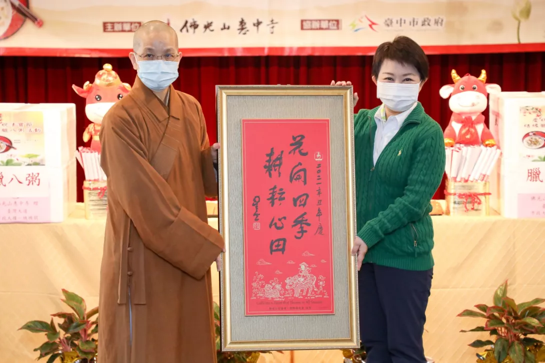 農曆十二月初八為佛陀成道日,又稱「法寶節」,佛光山惠中寺為感謝台中市政府長期對市政的貢獻,今(13)日準備臘八粥、春聯及紅包致贈洽公民眾及市府員工。台中市長盧秀燕表示,過去一年因疫情充滿各種挑戰,今年佛光山將於台中市擴大發放8萬碗臘八粥,盼讓社會更平安、市民更幸福。她也祝福市府同仁工作順利、市民健康快樂。