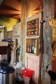 店內裝潢「物盡其用」是老闆李守智的理念,他表示,店裡百分之九十的裝潢取材自廢棄物品,例如燈就是老闆家中舊有的,改裝上陣,而店裡的桌子也是在海邊撿來漂流木,再特別製成,顯現李守智多方利用回收素材的理念。