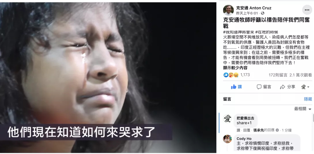 【請大家協助分享祈福】 克安通牧師 臉書發文:「火葬場空間不夠堆放死人、染疫病人們怎麼都等不到氧氣的供應、醫護人員因為封鎖沒有食物吃........,印度正經歷極大的災難,在這之前,需要極多極多的禱告,才能有機會看到局勢被扭轉。我們正在奮戰中,需要你們用禱告陪伴我們堅持下去!」。 網路公益平台創辦人張成先力挺相關行動,第一時間已經透過百萬粉絲網路公益平台協作推播相關內容,他說:「我們只有一個地球,同球一命,必須發揮四個關懷的精神,一起突破這次世紀災難」 受到肺炎疫情影響,印度總理莫迪也將不會出席G7實體峰會,英國首相強森與印度總理莫迪於法國舉辦的G7峰會中曾會面磋商。 中國紅十字會也向印度提供現金及物資援助,首批援助印度的抗疫物資,包括製氧機及呼吸機,也已經由成都運往印度班加羅爾。 印尼也以專機運送200台製氧機,協助印度抗疫。