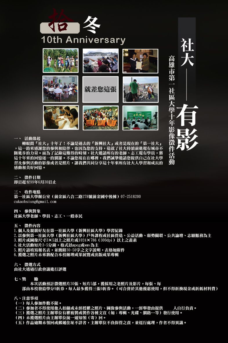 徵文活動有以下三個主題:「我理想中的社區大學」、「我的社大生活」、「我印象最深刻的一門課/老師」,欲參加者請選擇一個主題。「十年,有「影」」影像徵件活動包含照片或圖像尺寸3×5以上之照片或1024×786(300dpi)以上之畫素,填寫報名表,並簡附30~50字之文字說明;社大活動短片3-5分鐘,格式以mpeg或wmv為主,即日起收件到6月30日止。有關各項活動詳細訊息歡迎上社大網站查詢(http://khhcu.sam.com.tw/),或撥打專線洽詢(07)251-8200。