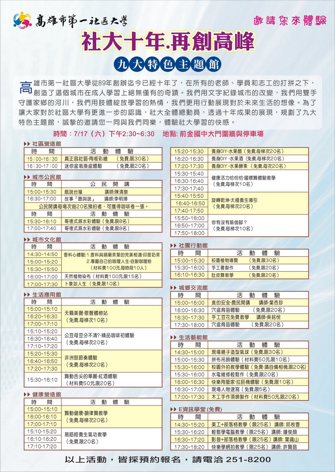 高雄市第一社區大學從89年創辦至今已經十年了,在所有的老師、學員和志工用心的打拼下,創造了許多學習的奇蹟;為了展現十年的成果,正舉辦徵文及「十年,有「影」」影像徵件活動,還特別規劃了九大特色主題館,七月十七日下午歡迎大家與第一社大同樂,一同參與各項的體驗活動。