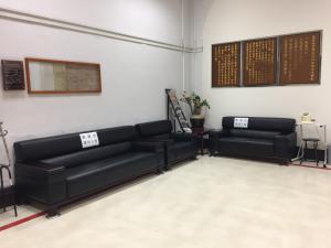 監察院靠近財產申報處的外牆有一工人孤獨的施工!陳情中心內部的沙發上,張貼防疫期間保持社交距離的字條!