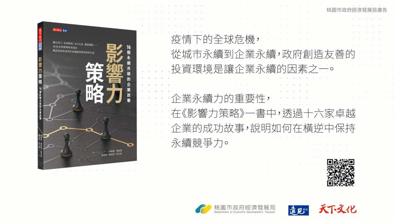 經濟發展局郭裕信局長表示,在這波疫情之後,現階段我們共同面對的挑戰,是如何讓受到疫情衝擊的產業盡快復甦,並針對疫情之後生活習慣的改變,企業如何轉型及因應,這需要所有在地企業與市府一起努力。期待企業能藉由這本書得到許多啟發,把握機會在疫情後打造一個更永續而友善的經營環境。《影響力策略:16個永續共榮的企業故事》由桃園市政府經濟發展局出版,並於各大通路販售。此外,111年桃園市金牌企業卓越獎徵件中,至110年8月31日截止,歡迎企業踴躍報名!