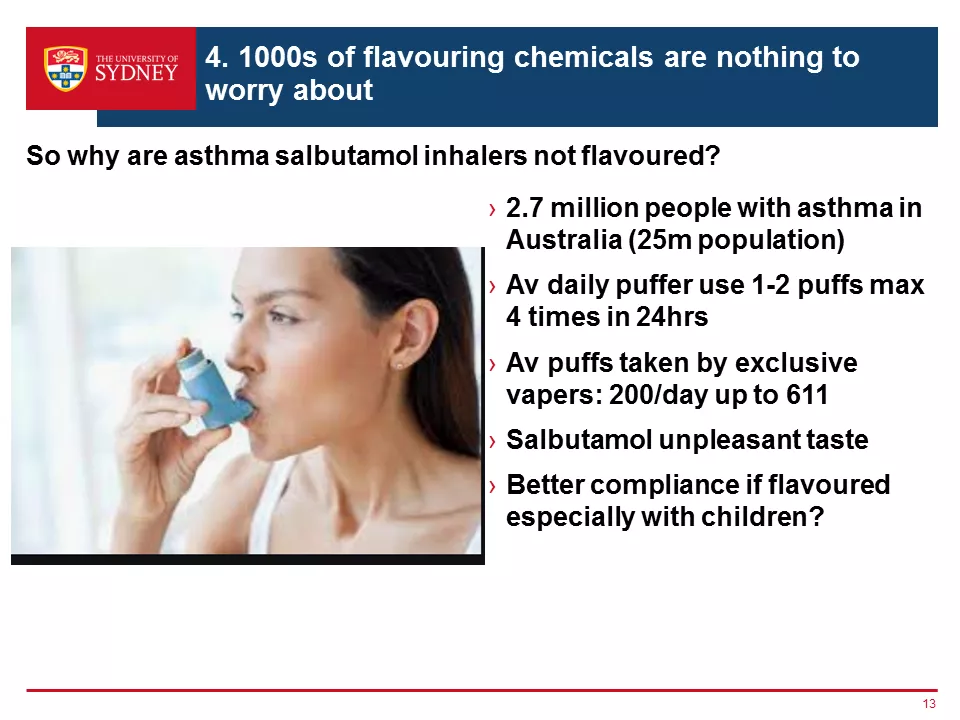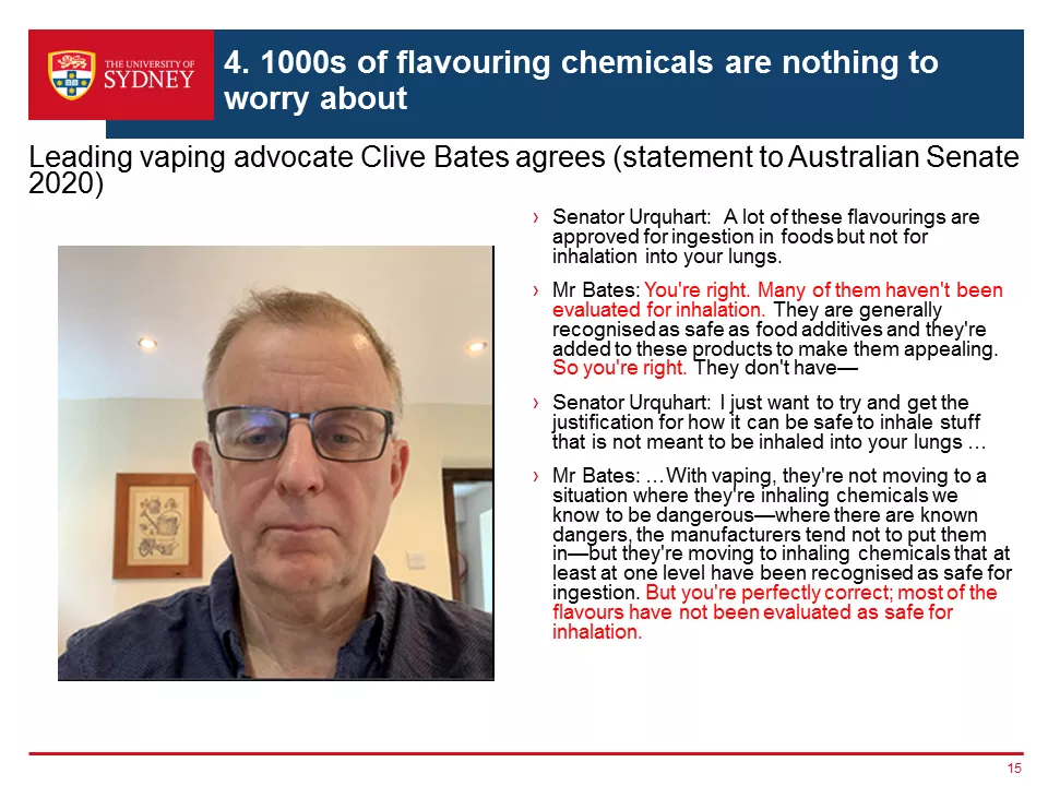 事實:氣喘的兒童會因為不喜歡氣管擴張吸入劑的味道,而不按時用藥,但是從來沒有吸入劑會因此加入調味料!美國香精及粹取製造協會(FEMA) 2021年指出:「電子煙商不能因加入的是食品級的香料劑,就說其產品中的香料成分安全無虞,如此聲明是誤導且造假。」連國際倡議電子煙最活躍的英國學者Clive Bates都公開承認:「這些香精僅獲准於食用,從未評估吸入肺部的安全性」!