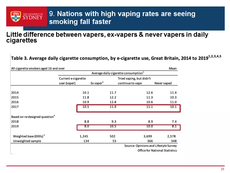 事實:大部分嘗試電子煙的吸菸者是期望減少菸量,但使用電子煙後大多仍繼續吸菸,真正減少菸量者不多,成功戒菸者更少。研究發現,吸紙菸者無論是同時吸電子煙、曾經吸電子煙後來停吸、或從沒來吸過電子煙,他們的每日吸紙菸量幾無差異。國家整體吸菸率降低與提高菸稅菸價有關,與藉著電子煙嘗試戒菸的人數增多無關。