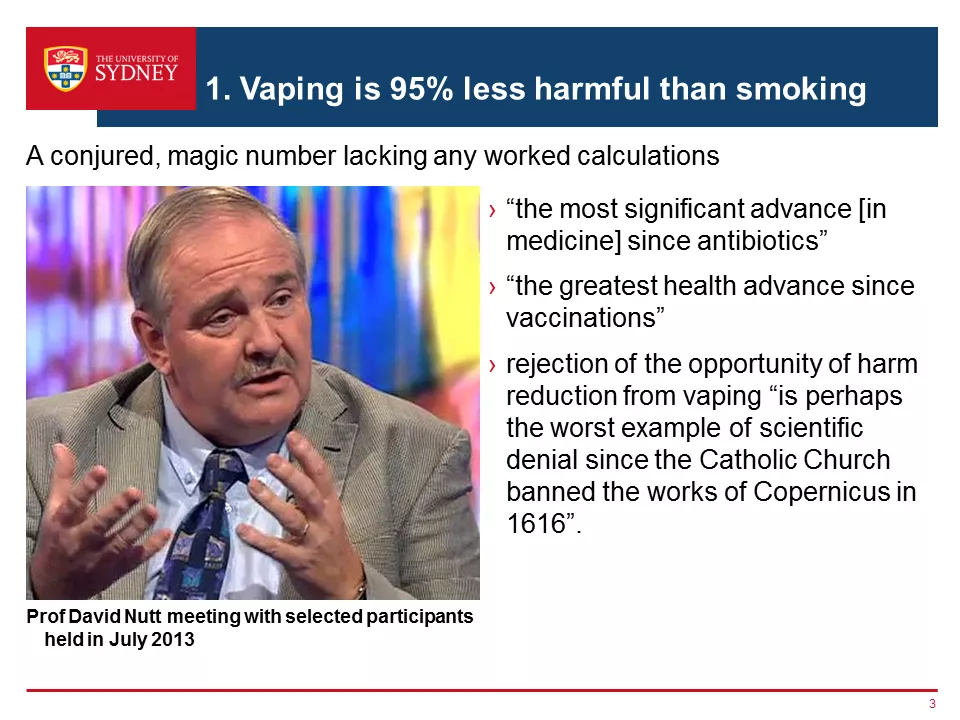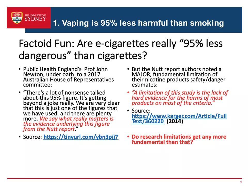 事實:連美國的知名電子煙推崇者,也是獨立研究者Carl Philips都說:「電子煙的危害少95%,這是無稽之談!這只是一個以假亂真的說詞,起源於英國衛生部(Public Health England,PHE) 的報告,錯誤引用一個來自垃圾科學雜誌(junk-science journal,為政治、意識形態、經濟目的而捏造的非科學內容)的造假數字。」事實上,吸菸所引起的慢性病需要很長的潛伏期(20-50年),但電子煙在一些國家大多流行5-10年(如:英國、美國、法國),目前根本無法判斷實際危害程度。