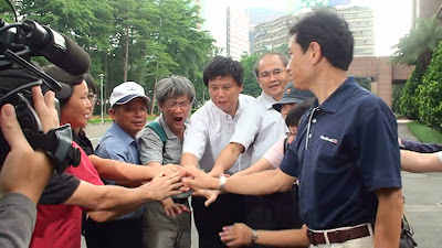 會後學者、以及灣寶的洪箱、二重埔的劉慶昌、璞玉的田正祿、大埔的葉秀桃、青年學生林樂昕及陳建泰,手連手大喊「團結、團結、團結」。