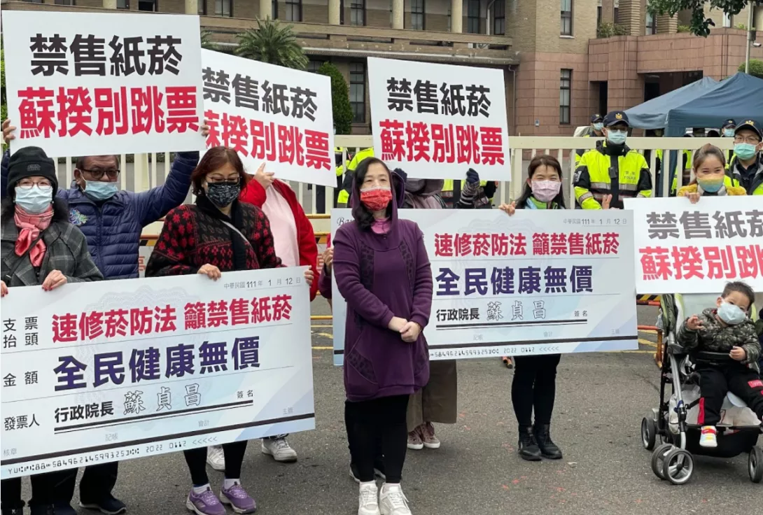 2021年12月底,有婦幼團體舉著「速修菸防法、蘇揆勿跳票」與「禁售紙菸、守護孩子」等紙牌標語在行政院外陳情,甚至連續三天於上下班時間在行政院外繞行,目的就是要呼籲行政院盡快將《菸害防制法》送進立法院審查,以行動訴求政府有義務重視菸害防制議題,並維護家人和孩子的健康。