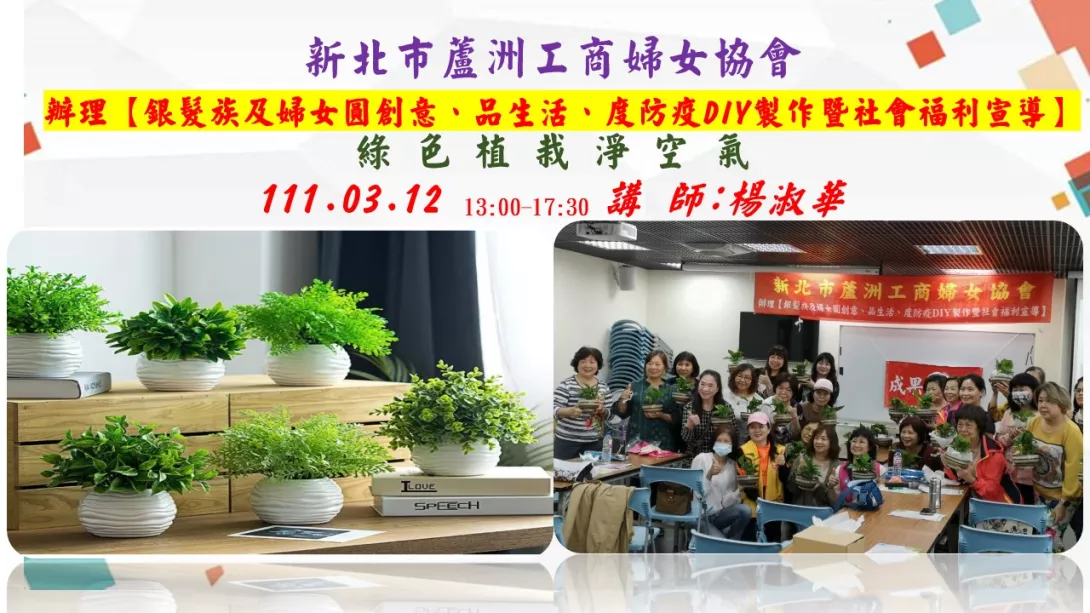 111年03月12日協會在新北市蘆洲區溪墘活動中心,辦理『111年銀髮族及婦女圓創意、品生活、度防疫DIY製作及社會福利宣導』活動第一場次三堂課,有新北防疫超前為你及新北5心級防疫宣導、性別友善資料包說明、防疫包製作及綠色植栽淨空氣等課程,還有反家暴宣導。