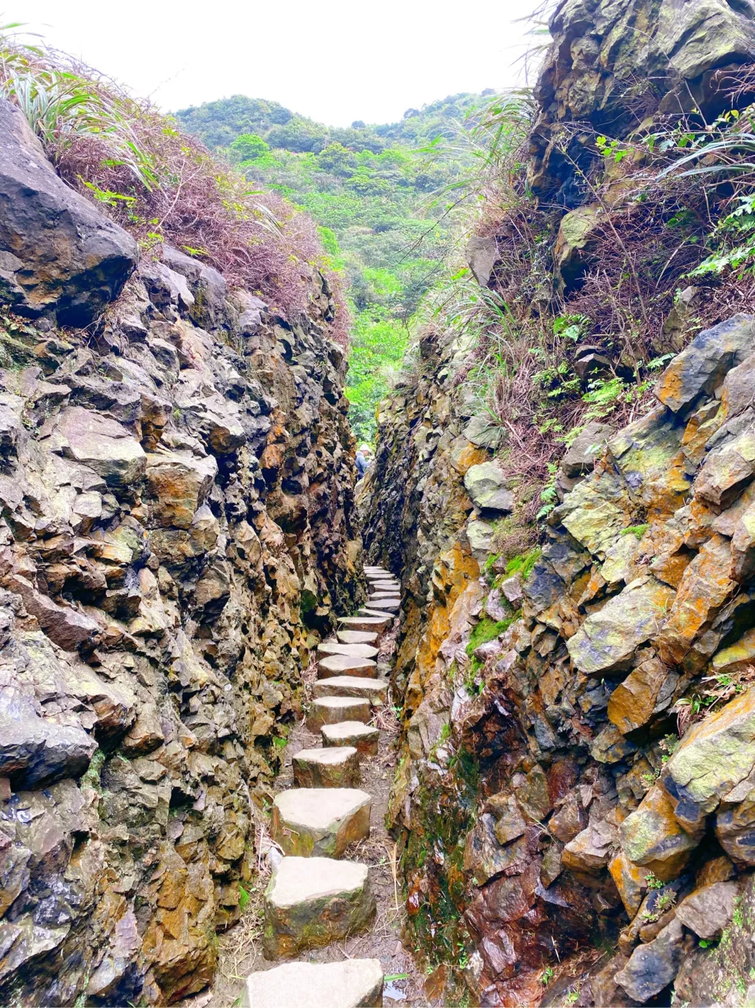 緊接著矗立在眼前的,是一塊被鑿開成二半的巨石,中間的通道有擺放石塊讓人行走,通道的長度約18公尺,寬度大概只有6、70公分左右,看起來相當狹窄,所以有「摸乳巷 」或是「一線天」的稱號,這裡也是IG爆紅的熱門打卡景點,往前沒有多久就會在地上看到大型的黑色水管,繼續前行則會回到柏油路面。