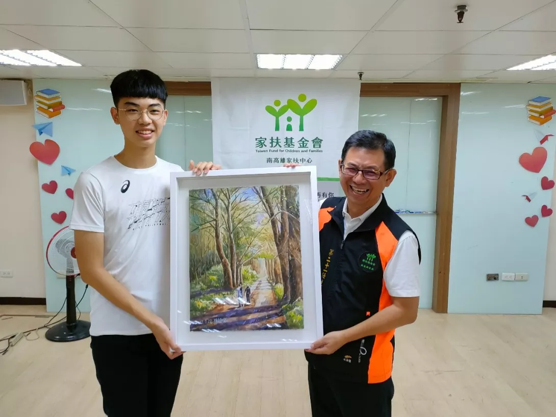 本次規劃親子互動活動,邀請高雄在地紙芝居故事的紅豆冰哥哥來說故事,多元豐富的故事內容可以有親子共學和故事互動學習,參與活動的小欣媽媽表示:『現在景氣不好,加上疫情下大家的生活都不好過,還好有這些愛心人士提供生活用品減輕我們的負擔,又可以帶孩子來聽故事放鬆一下,真的是很感謝』。今天接受捐贈繪畫優秀獎助學金的小安曾獲得全國美展佳作、高雄市美展第一名的好成績,小安表示:『很感謝汎武公司叔叔阿姨的鼓勵,讓我有機會領到這筆獎助學金,有了這筆錢就能添購美術用具,我的目標是當美術老師,我會更加努力,畫出更棒的作品出來』。小安有感而發的表示,這些有愛心的捐贈人就像是一片乾淨且清新的森林,讓我們可以在裡面安心且自在的遨遊,雖然疫情下的生活帶給人們許多不便,但溫暖一直存在,因此特別創作『閒情逸致』一副畫,回贈給捐贈人代表感謝之意。