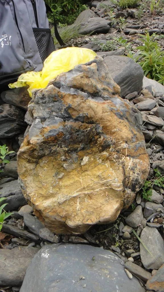 老師以口頭介紹完大伯爺廟的典故之後,我們就直奔大伯爺溪的上游河床,冬山石除了主要產於大伯爺溪,另外冬山鄉境內的虎頭坑、月眉溪、力霸溪、十三分溪、新寮溪、舊寮溪也有這種造型獨特的矽質泥岩,統稱為冬山石。雖然今年9月17日的「凡那比」颱風並無帶來巨大雨量沖刷河川巨石,我們很幸運還是找到幾顆冬山石作為教學解說之用。