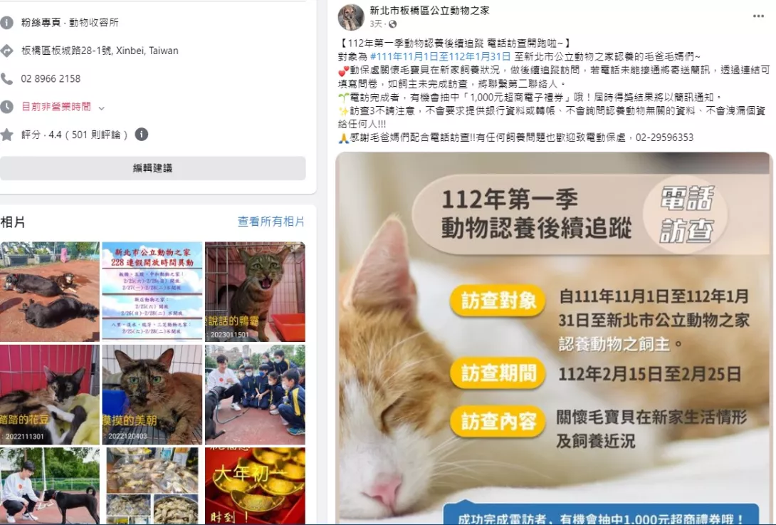 除線上認養追蹤群組動物之家每季皆會電話訪查 圖片提供/新北市政府動物保護防疫處