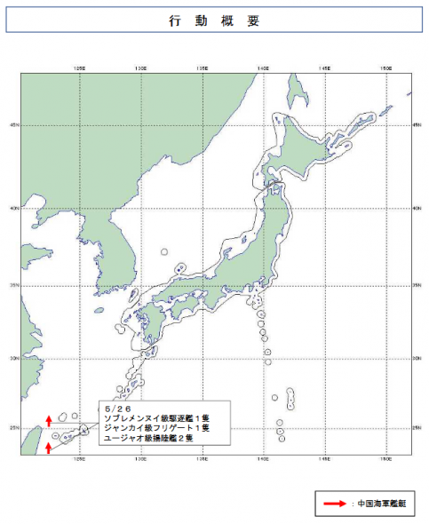 日本防衛省統合幕僚監部昨(29)日公布共艦動態,統幕表示,26日16時許,海上自衛隊在沖繩縣與那國島以南約130公里的海域發現4艘中共軍艦,分別是現代級飛彈驅逐艦1艘、054型飛彈護衛艦1艘及071型綜合登陸艦2艘。統幕指出,這4艘中共軍艦朝北穿越日本與那國島與台灣宜蘭之間的海域,最後在釣魚台以西約80公里的海域北上航行。