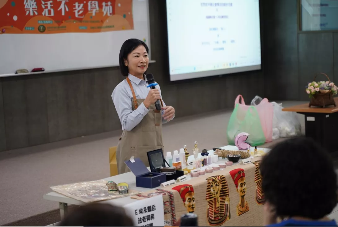 素燕苑長接著示範品牌的創意發想。她表示,本次製作的保養品品牌定調為埃及豔后克麗奧佩脫拉夫人(Lady Cleopatra),是因為其可謂是最早的「時尚女神」,怎麼說呢?說出來保證嚇你一跳,想不到早在3000多年前,埃及豔后就已經創造出了許多保養品跟保養方法,諸如:面膜、黃金埋線、泡牛奶澡、用啤酒泡沫洗臉、將孔雀石磨成粉當眼影、用鉛畫眼線抵擋陽光,也可以說是最早的墨鏡、木薯粉跟糯米來防曬,甚至開了化妝品工廠,聽完有沒有覺得這個品牌定調非常合情合理了呢?今天的桌巾印著古埃及文物圖案,素燕副理事長真是太用心了!