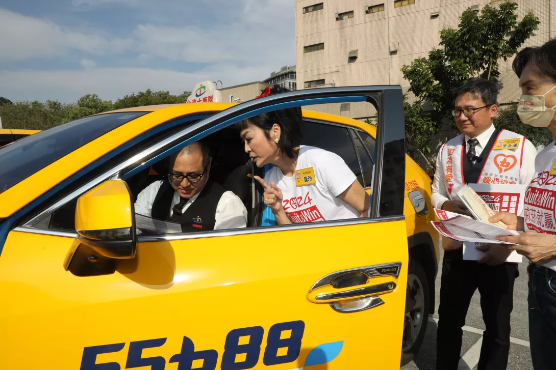衛生福利部國民健康署、臺北市政府衛生局、台灣計程車駕駛暖心協會與董氏基金會聯手前進大直計程車服務站,向運將推廣「萬眾一心、快樂戒菸」,兩位「曾是老菸槍」的義工唐玲及終身義工陳淑麗發送「2024戒菸就贏比賽」報名表傳單,與運將面對面、手把手協助運將報名戒菸,鼓勵駕駛們「一起戒就不難」!