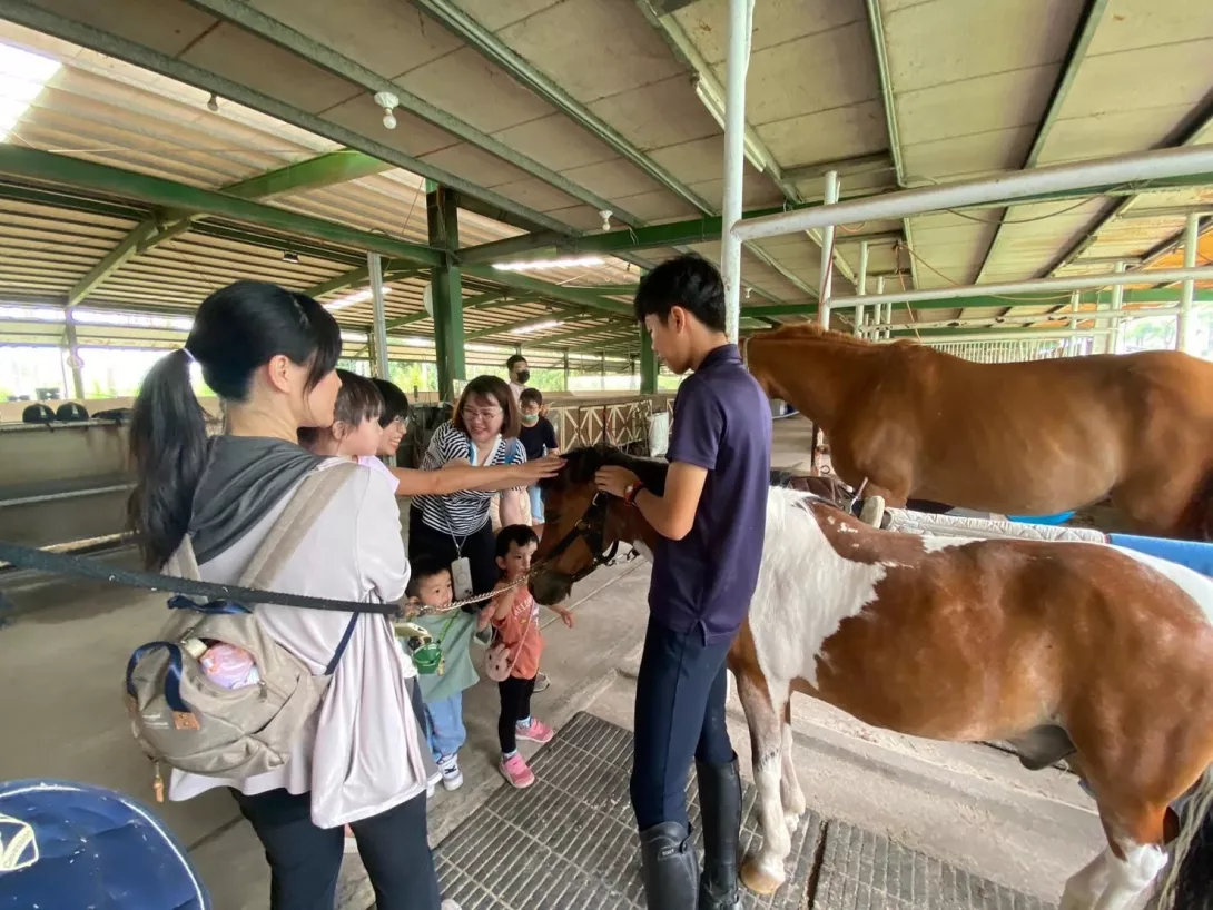馬場的工作人員說明馬匹習性,邀請小朋友觸摸