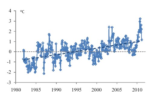 本圖繪出北大西洋格陵蘭島南方的海域(40N-60N) (30W -50W)間,1981.11 ~ 2011.2 的逐月海平面溫度 (已去除月變化) 。 資料來源(IRI, IGOSS nmc Reyn_SmithOIv2 monthly SST) 關於作者