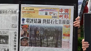 另外,「聯蚵報」頭版報導「感動大甲媽,媽祖顯靈保佑白海豚」。「自由蚵報」報導:「大逆轉!國光石化難敵人民力量」。「中國蚵報」除了報導:「環評結論終結石化擴張」外,也強調:「好家在有選舉,白海豚不轉油政府轉」。