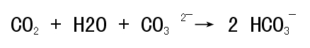 大氣中的二氧化碳進入海水中,則會產生一些化學效應。首先,溶解於水中的二氧化碳和水分子會產生碳酸,而碳酸會解離成氫離子與碳酸氫根,誠如以下方程式A。
