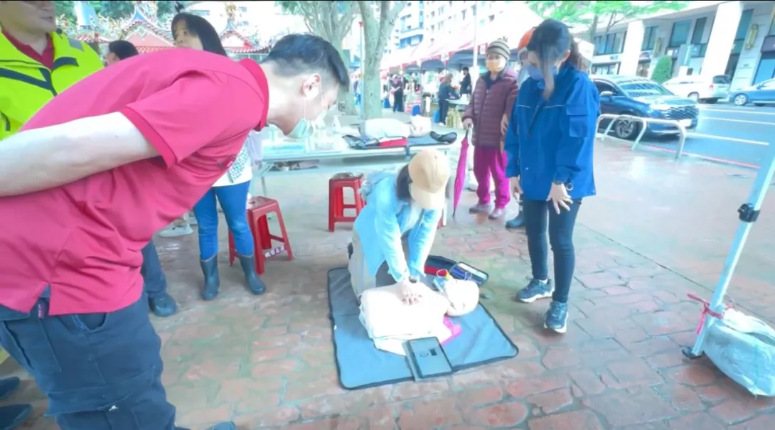 這個位置兩乳之間,然後兩隻手然後要握緊,然後用手腕的力氣,然後大概一分鐘,大概要壓100~120下左右。防災教育一起來。