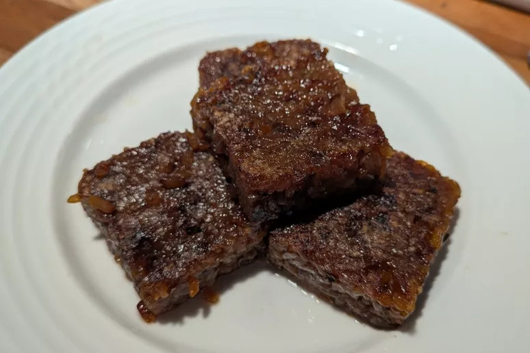 依序上桌的是「大陳饃糍」、「炒糕」、「黑糖薑作糕」,饃糍是以糯米粉及在來米粉製作,油煎後外酥內軟,口感近似韓式年糕,搭配蛋液乾煎酥皮,菊子姊提醒看像常見早餐的蘿蔔糕蛋餅,只是大陳年糕摸起來很硬,下鍋炒過卻非常軟Q。產品口感紮實, 而磨糍是用糯米做的。