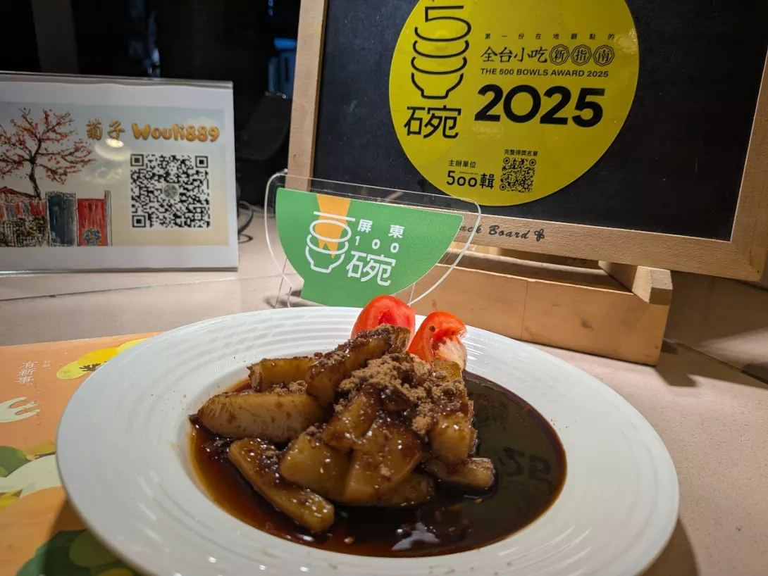 後期再會時獲得500與100碗的榮譽,「黑糖薑作年糕」是使用蓬萊米黏性強,做年糕製成長柱狀,糕體吸足水份,炒製過程才會水嫩Q彈,甜味口感黑糖手工炒過,老酒的香氣中帶薑辣,且有暖暖保養身體,香氣層次帶有懷舊的風味。