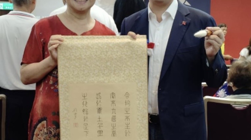The Calligraphy Immortal Sect Grandmaster Liu Chien Presents Large Seal Script “The Highest Good is Like Water” to Ms. Wang Chien-Chiu