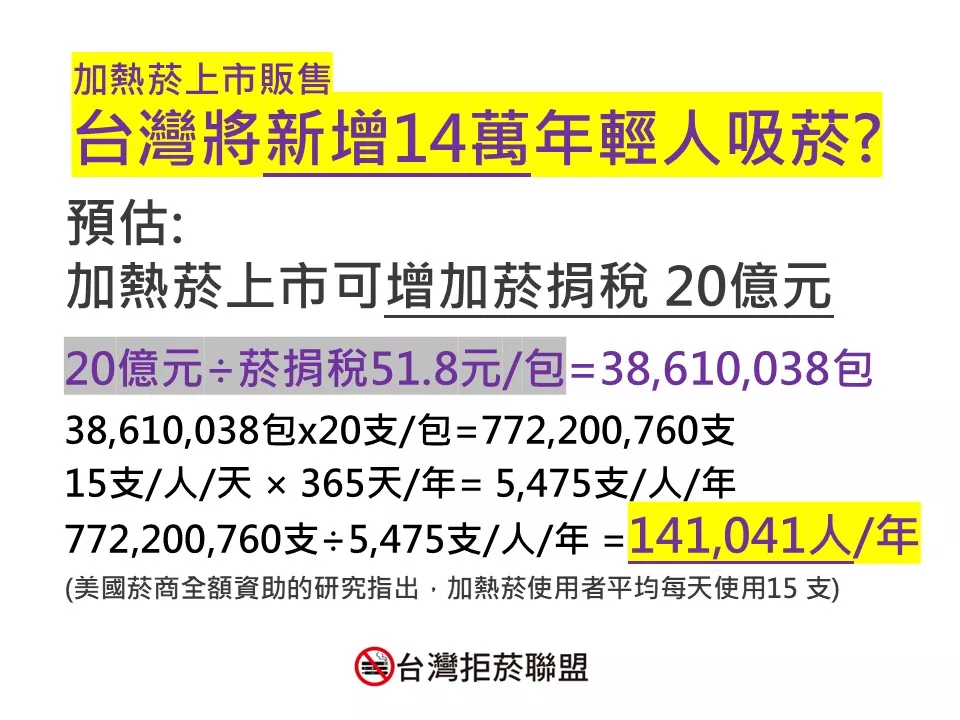 國教行動聯盟理事長王瀚陽指出,菸商行銷加熱菸就是鎖定年輕人,政府預估加熱菸上市可增加20億菸捐稅收,換算後顯示「將新增14萬年輕人加入吸菸的行列」,但政府一直延宕公告禁止加味菸品、也不先提出相應配套措施再開放加熱菸上市?要等對年輕人造成傷害了再來補救?王瀚陽質疑,政府順序錯置,又看不到完整明確的配套措施,要如何保護年輕人免於加熱菸害危機?