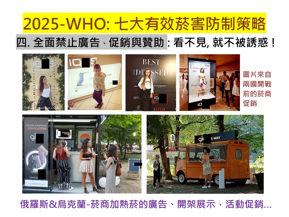 身為三個女兒的媽媽,台灣家長守護婦幼權益協會秘書長駱怡汝拿著「烏克蘭及俄羅斯在開戰前大街小巷充斥的加熱菸廣告」照片,語重心長地說:「菸害防制法修法期間,國健署也一度主張加熱菸載具是3C產品!幸好我們成功阻擋『讓台灣不會有像照片中到處都是加熱菸廣告的悲劇』」;但現實的生活中,我們在網路上仍可輕易接觸到光鮮亮麗的加熱菸廣告!請求政府確實拿出行動,守護下一代健康。