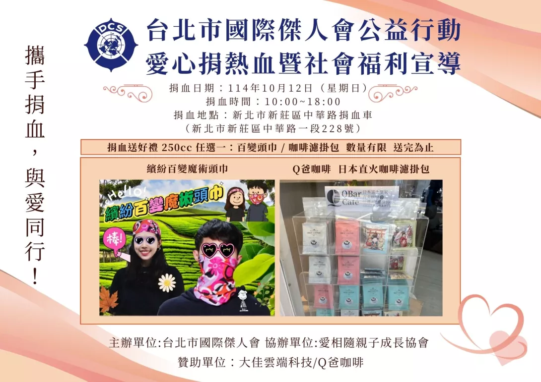 本次活動由 台北市國際傑人會李國憲會長 帶領志工團隊全程參與,並聯合 愛相隨親子成長協會、技佳事業股份有限公司王萍和創辦人 以及 Q爸咖啡 攜手舉辦。凡當日成功捐血者,可獲贈「日本直火咖啡濾掛包」或「繽紛百變魔術頭巾」乙份,感謝每位愛心捐血人的善舉與支持。
