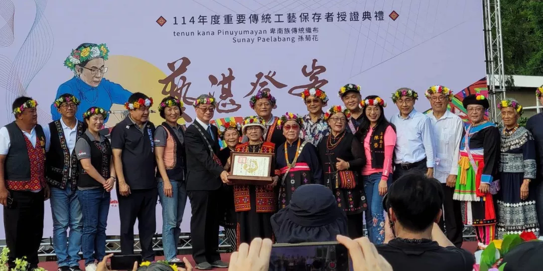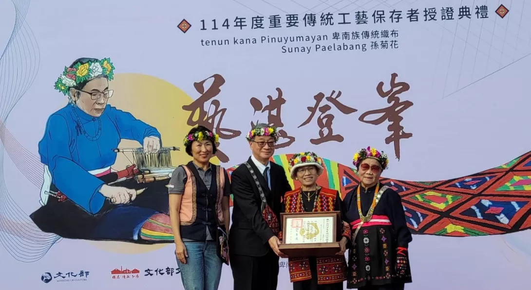 臺東縣卑南族下賓朗部落於今(12)日迎來一樁文化盛事。文化部「藝湛登峯-114年度重要傳統工藝授證典禮」首度移師部落舉行,由文化部長李遠親臨孫大川舊居,正式頒授重要傳統工藝「tenun kana Pinuyumayan卑南族傳統織布」保存者認定證書予孫菊花(Sunay Paelabang)藝師。這項榮譽不僅讓高齡88歲的孫菊花老師獲封「人間國寶」,更象徵卑南族瀕臨失傳的傳統織布技藝得到國家級的最高肯定,為臺東多元族群文化傳承寫下光榮的一頁。