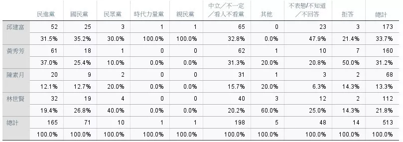 在政黨傾向交叉分析中,邱建富在跨黨吸納能力上展現優勢。