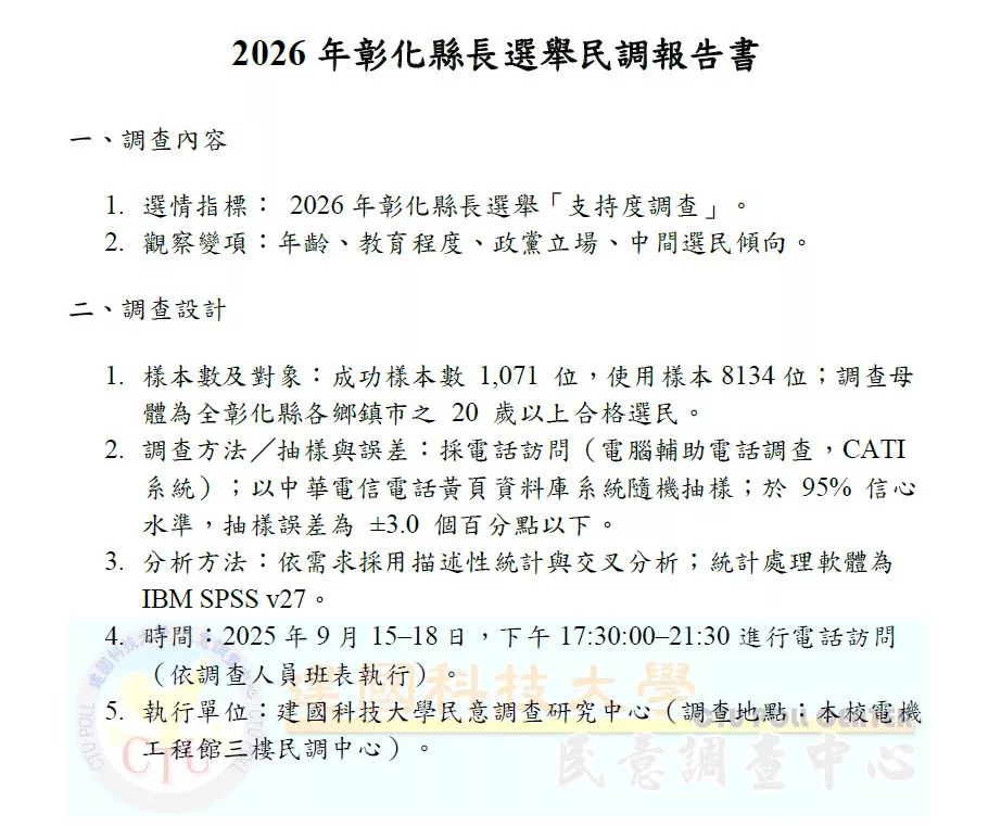 2026年彰化縣長選舉雖距離登場仍有一年多,但我們獨家取得最新一份由建國科技大學民調中心出爐的縣長選情調查,已為這場中台灣指標性戰役掀開序幕。