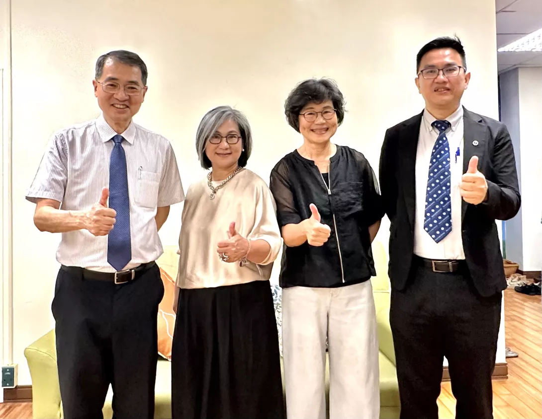暨大校長武東星(左起)、諮人系沈慶鴻教授、家暴研究中心主任王珮玲特聘教授、副校長曾永平,於暨大「穿山甲的療心室」合影。
