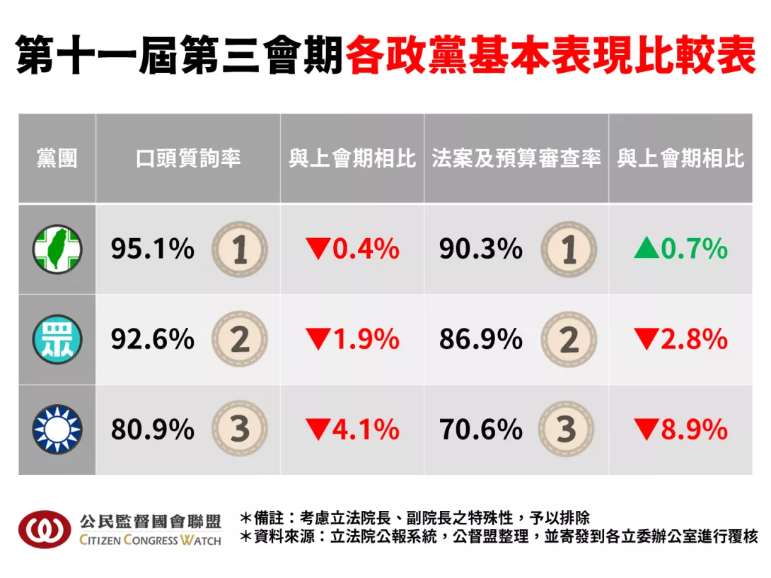 公督盟執行長張宏林表示:「本會期延會近三個月,創下史上最長紀錄!然而回顧這段期間,立法院不僅沒有展現應有的立法效率,反而淪為『假開會、真怠惰』!若細看各政黨的平均口頭質詢率,以及法案及預算審查率,可以發現國民黨的基本問政表現皆是敬陪末座,並且與其他政黨有不小落差,顯然是黨內部分立委疏於問政,自我閹割立法權!公督盟再次強調立法委員身為人民公僕,一個月領超過二十萬的公帑、上千萬補助,開會、質詢本來就是其本分,怠忽職守的立委必將負起政治責任!