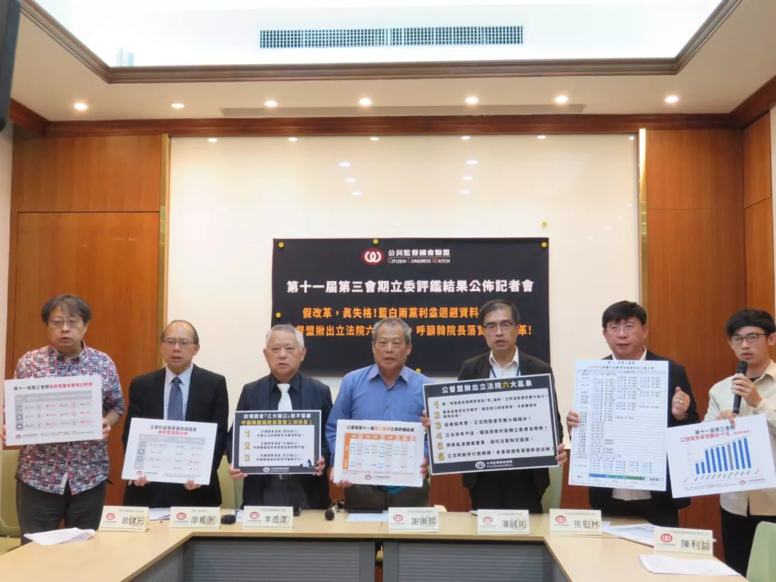 公督盟理事長謝東儒補充:「本會期創下史上最長延會,但是綜觀整體國會問政表現卻依舊低迷,許多委員會安排大量和災情、議案無關的考察,跑地方綁樁救罷免,讓原本可以從從容容的立法進度,搞成匆匆忙忙,連滾帶爬,不僅許多重要民生法案進度卡關,今年度的國營事業預算準備拖到十一月才要協商,讓整體國政陷入停滯,對民主國家而言,要先有正常國會,才有正常國家!因此,公督盟點出本會期立法院六大亂象,並且鄭重呼籲韓國瑜院長作為立法院的領導者應盡速落實三項改革!」