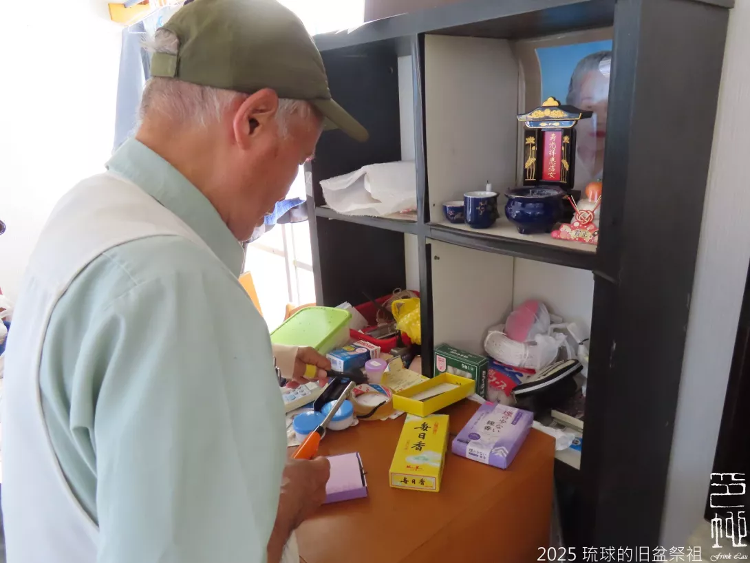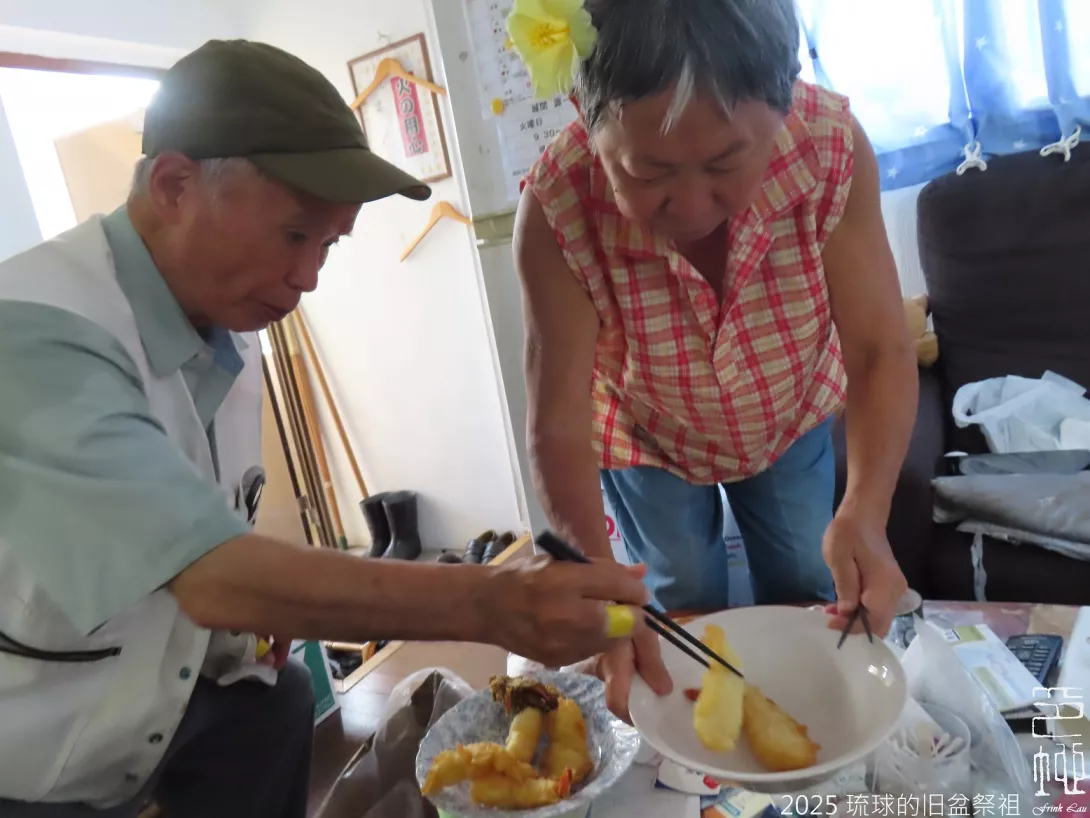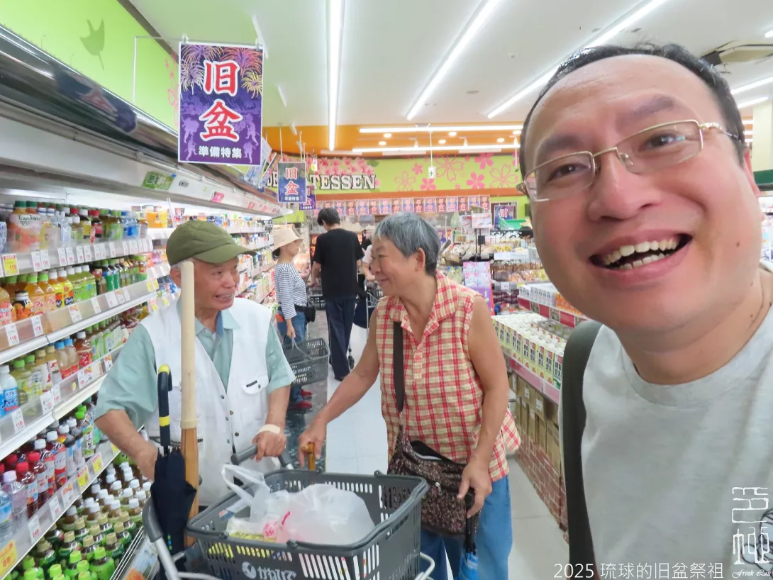 琉球傳統,在旧曆(農曆、陰曆、舊曆) 7 月 13 日至 15 日 舉行三天的儀式迎接、供養、送還祖先靈魂,儀式期間散居各地的琉球人回到家鄉祭祖,Frink Lau 劉天倫也和母親鄭安琪前往外公鄭曾祜的學生城間源一家中祭拜他的母親城間美惠(娘家姓平良),從前 Frink Lau 劉天倫的外婆鄭陳麗艷來琉球遊玩也拜訪過城間美惠,我們回憶城間母親的奶奶等祖先的事情;沖繩的賣場、市場為旧盆祭祖推出各種商品,傳統會以水果和麻糬等食物進行捻香祭拜,本篇由 Frink Lau 劉天倫拍攝