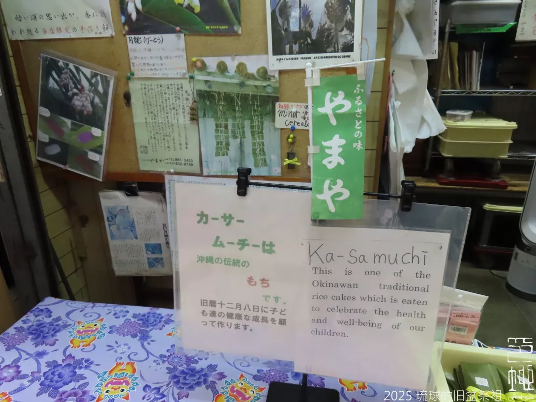 補充:通常旧盆祭祖使用的麻糬和臺灣常見的圓形麻糬差別不大,不過這裏販賣麻糬的地方也販賣一種琉球特有、以月桃葉包裹的扁形麻糬「 かーサー Ka-sa muchi 鬼餅」(本篇第 5 圖),我們在購買一般麻糬時也順道購買來祭拜,關於 かーサー Ka-sa muchi 鬼餅,琉球另有一個 12 月 8 日的鬼餅之日,相關資訊可參考以下鏈結: